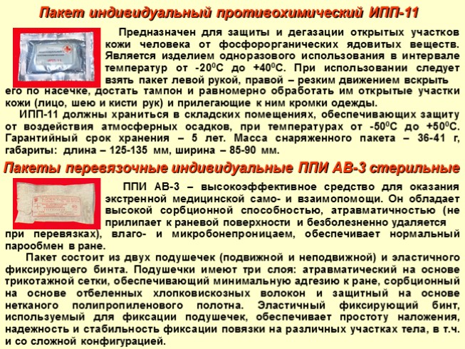 ИПП-11 должны храниться в складских помещениях, обеспечивающих защиту от воздействия атмосферных осадков, при температурах от -500С до +500С. Гарантийный срок хранения – 5 лет. Масса снаряженного пакета – 36-41 г, габариты: длина – 125-135 мм, ширина – 85-90 мм.