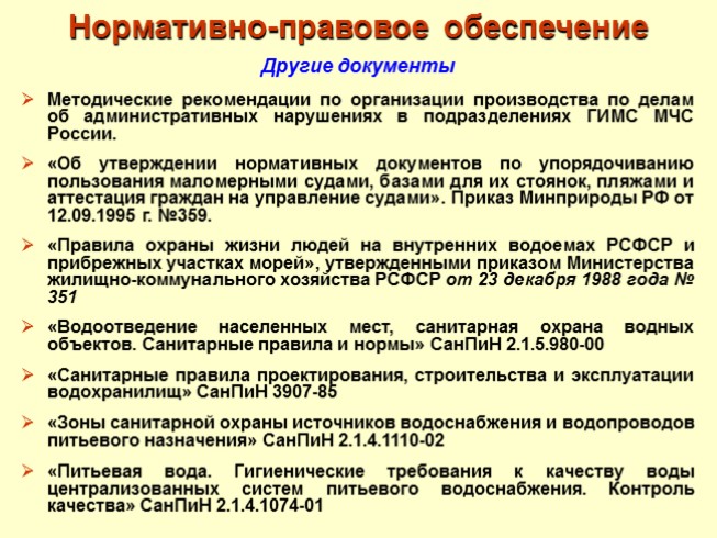 Другие документы Методические рекомендации по организации производства по делам об административных нарушениях в подразделениях ГИМС МЧС России. «Об утверждении нормативных документов по упорядочиванию пользования маломерными судами, базами для их стоянок, пляжами и аттестация граждан на управление судами». Приказ Минприроды РФ от 12.09.1995 г. №359. «Правила охраны жизни людей на внутренних водоемах РСФСР и прибрежных участках морей», утвержденными приказом Министерства жилищно-коммунального хозяйства РСФСР от 23 декабря 1988 года № 351 «Водоотведение населенных мест, санитарная охрана водных объектов. Санитарные правила и нормы» СанПиН 2.1.5.980-00 «Санитарные правила проектирования, строительства и эксплуатации водохранилищ» СанПиН 3907-85 «Зоны санитарной охраны источников водоснабжения и водопроводов питьевого назначения» СанПиН 2.1.4.1110-02 «Питьевая вода. Гигиенические требования к качеству воды централизованных систем питьевого водоснабжения. Контроль качества» СанПиН 2.1.4.1074-01