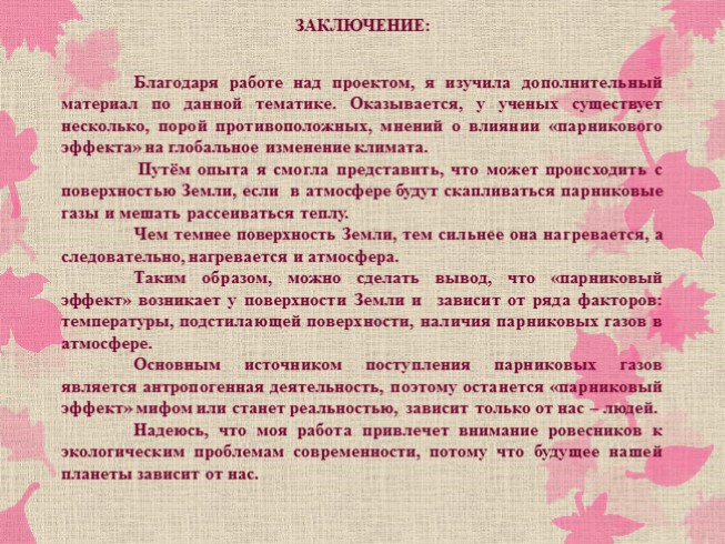 Благодаря работе над проектом, я изучила дополнительный материал по данной тематике. Оказывается, у ученых существует несколько, порой противоположных, мнений о влиянии «парникового эффекта» на глобальное изменение климата.