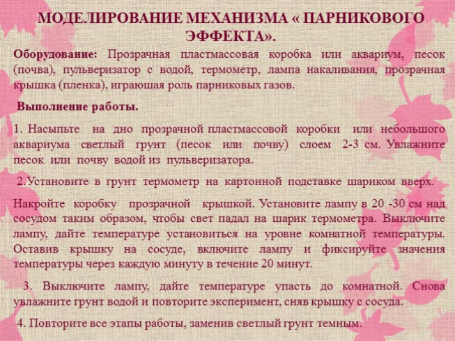 Оборудование: Прозрачная пластмассовая коробка или аквариум, песок (почва), пульверизатор с водой, термометр, лампа накаливания, прозрачная крышка (пленка), играющая роль парниковых газов.