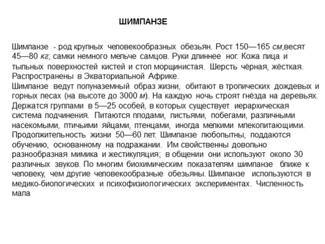 Шимпанзе - род крупных человекообразных обезьян. Рост 150—165 см,весят 45—80 кг; самки немного мельче самцов. Руки длиннее ног. Кожа лица и тыльных поверхностей кистей и стоп морщинистая. Шерсть чёрная, жёсткая. Распространены в Экваториальной Африке.
