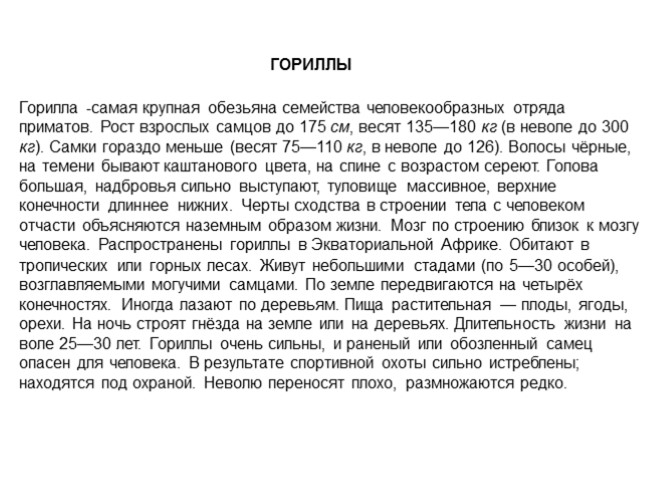 Горилла -самая крупная обезьяна семейства человекообразных отряда приматов. Рост взрослых самцов до 175 см, весят 135—180 кг (в неволе до 300 кг). Самки гораздо меньше (весят 75—110 кг, в неволе до 126). Волосы чёрные, на темени бывают каштанового цвета, на спине с возрастом сереют. Голова большая, надбровья сильно выступают, туловище массивное, верхние конечности длиннее нижних. Черты сходства в строении тела с человеком отчасти объясняются наземным образом жизни. Мозг по строению близок к мозгу человека. Распространены гориллы в Экваториальной Африке. Обитают в тропических или горных лесах. Живут небольшими стадами (по 5—30 особей), возглавляемыми могучими самцами. По земле передвигаются на четырёх конечностях. Иногда лазают по деревьям. Пища растительная — плоды, ягоды, орехи. На ночь строят гнёзда на земле или на деревьях. Длительность жизни на воле 25—30 лет. Гориллы очень сильны, и раненый или обозленный самец опасен для человека. В результате спортивной охоты сильно истреблены; находятся под охраной. Неволю переносят плохо, размножаются редко.