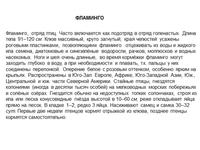 Фламинго, отряд птиц. Часто включается как подотряд в отряд голенастых. Длина тела 91–120 см. Клюв массивный, круто загнутый; края челюстей усажены роговыми пластинками, позволяющими фламинго отцеживать из воды и жидкого ила семена, диатомовые и синезелёные водоросли, рачков, моллюсков и водных насекомых. Ноги и шея очень длинные, во время кормёжки фламинго могут заходить глубоко в воду, а при необходимости и плавать, т.к. пальцы у них соединены перепонкой. Оперение белое с розовым оттенком, особенно ярким на крыльях. Распространены в Юго-Зап. Европе, Африке, Юго-Западной Азии, Юж., Центральной и юж. части Северной Америки. Стайные птицы, гнездятся колониями (иногда в десятки тысяч особей) на мелководных морских побережьях и солёных озёрах. Гнездится обычно на недоступных топких солончаках, строя из ила или песка конусовидные гнёзда высотой в 10–60 см, реже откладывает яйца прямо на песок. В кладке 1–2, редко 3 яйца. Насиживают самец и самка 30–32 сут. Первые две недели птенцов кормят отрыжкой из клюва, позднее птенцы кормятся самостоятельно.