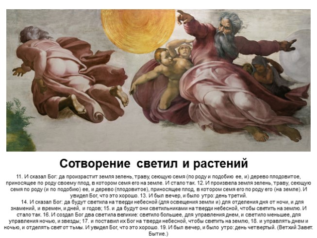 14. И сказал Бог: да будут светила на тверди небесной (для освещения земли и) для отделения дня от ночи, и для знамений, и времен, и дней, и годов; 15. и да будут они светильниками на тверди небесной, чтобы светить на землю. И стало так. 16. И создал Бог два светила великие: светило большее, для управления днем, и светило меньшее, для управления ночью, и звезды; 17. и поставил их Бог на тверди небесной, чтобы светить на землю, 18. и управлять днем и ночью, и отделять свет от тьмы. И увидел Бог, что это хорошо. 19. И был вечер, и было утро: день четвертый. (Ветхий Завет. Бытие.)