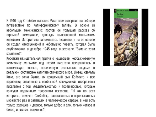 Короткая назидательная притча о нашедшем необыкновенную жемчужину мальчике под пером писателя превратилась в поэтическую повесть, населенную реальными людьми в реальной обстановке капиталистического мира. Ловец жемчуга Кино, его жена Хуана, их крошечный сын Койотито и все перипетии, связанные с необычной жемчужиной, изображены писателем с той убедительностью и поэтичностью, которые присущи подлинным творениям искусства. "И как во всех историях,- отмечал Стейнбек,- рассказанных и пересказанных множество раз и запавших в человеческое сердце, в ней есть только хорошее и дурное, только добро и зло, только четное и белое, и никаких полутонов".