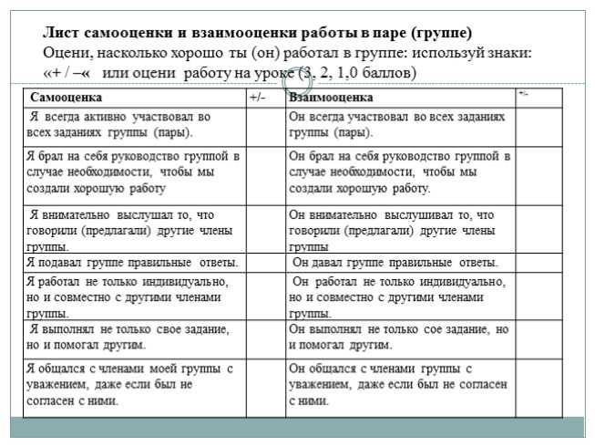 Оцени, насколько хорошо ты (он) работал в группе: используй знаки: «+ / –« или оцени работу на уроке (3, 2, 1,0 баллов)