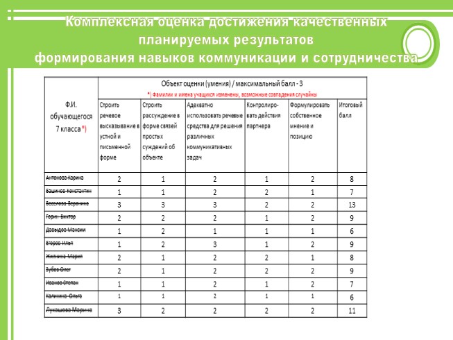 7 класса *) Строить речевое высказывание в устной и письменной форме Строить рассуждение в форме связей простых суждений об объекте Адекватно использовать речевые средства для решения различных коммуникативных задач Контролиро-вать действия партнера Формулировать собственное мнение и позицию Итоговый балл