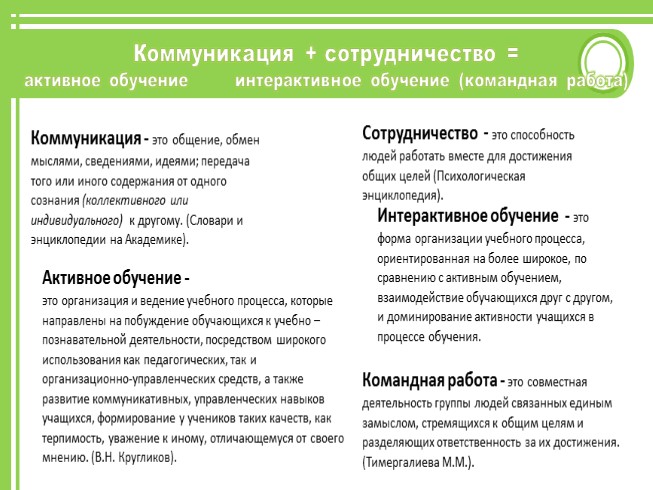 это организация и ведение учебного процесса, которые направлены на побуждение обучающихся к учебно – познавательной деятельности, посредством широкого использования как педагогических, так и организационно-управленческих средств, а также развитие коммуникативных, управленческих навыков учащихся, формирование у учеников таких качеств, как терпимость, уважение к иному, отличающемуся от своего мнению. (В.Н. Кругликов).