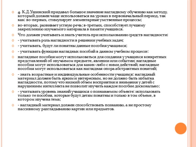 4. К.Д.Ушинский придавал большое значение наглядному обучению как методу, который должен чаще использоваться на уроках в первоначальный период, так как: во-первых, стимулирует элементарные умственные процессы;