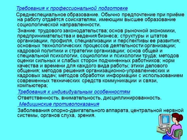 Менеджеру необходима хорошая подготовка в области экономики, права, социальной психологии, психологии труда, управления. Он должен знать трудовое законодательство, закономерности ценообразования, налогообложения, маркетинга, рекламы, технику ведения коммерческих переговоров, организацию производства. Должен ориентироваться в вопросах занятости, социальной защиты граждан, безопасности труда, конфликтологии, профессионального подбора, владеть навыками общения людьми. Желательно знание иностранного языка и умение работать на ПК.