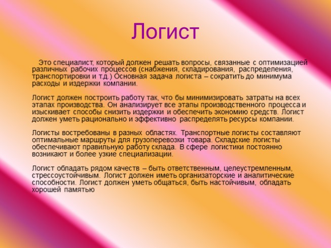 Это специалист, который должен решать вопросы, связанные с оптимизацией различных рабочих процессов (снабжения, складирования, распределения, транспортировки и т.д.) Основная задача логиста – сократить до минимума расходы и издержки компании. Логист должен построить работу так, что бы минимизировать затраты на всех этапах производства. Он анализирует все этапы производственного процесса и изыскивает способы снизить издержки и обеспечить экономию средств. Логист должен уметь рационально и эффективно распределять ресурсы компании. Логисты востребованы в разных областях. Транспортные логисты составляют оптимальные маршруты для грузоперевозки товара. Складские логисты обеспечивают правильную работу склада. В сфере логистики постоянно возникают и более узкие специализации. Логист обладать рядом качеств – быть ответственным, целеустремленным, стрессоустойчивым. Логист должен иметь организаторские и аналитические способности. Логист должен уметь общаться, быть настойчивым, обладать хорошей памятью