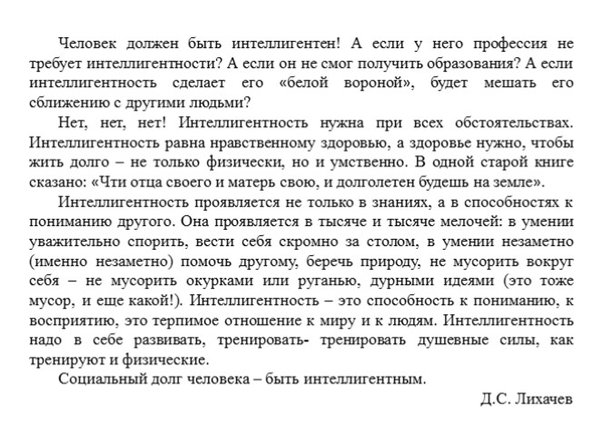 Интеллигентность проявляется не только в знаниях, а в способностях к пониманию другого. Она проявляется в тысяче и тысяче мелочей: в умении уважительно спорить, вести себя скромно за столом, в умении незаметно (именно незаметно) помочь другому, беречь природу, не мусорить вокруг себя – не мусорить окурками или руганью, дурными идеями (это тоже мусор, и еще какой!). Интеллигентность – это способность к пониманию, к восприятию, это терпимое отношение к миру и к людям. Интеллигентность надо в себе развивать, тренировать- тренировать душевные силы, как тренируют и физические.