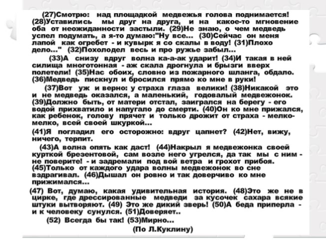 (27)Cмотрю: над площадкой медвежья голова поднимается! (28)Уставились мы друг на друга, и на какое-то мгновение оба от неожиданности застыли. (29)Не знаю, о чем медведь успел подумать, а я-то думаю:"Ну все... (30)Сейчас он меня лапой как огребет - и кувырк я со скалы в воду! (31)Плохо дело..." (32)Похолодел весь и про ружье забыл...