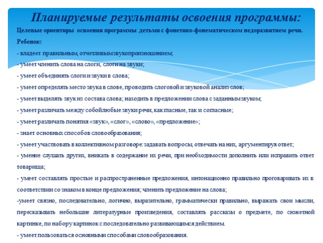 Целевые ориентиры освоения программы детьми с фонетико-фонематическом недоразвитием речи.