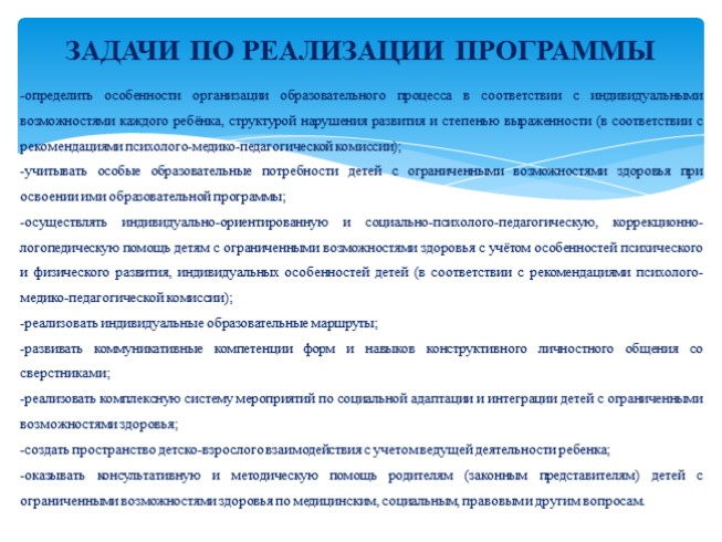 -осуществлять индивидуально-ориентированную и социально-психолого-педагогическую, коррекционно-логопедическую помощь детям с ограниченными возможностями здоровья с учётом особенностей психического и физического развития, индивидуальных особенностей детей (в соответствии с рекомендациями психолого-медико-педагогической комиссии);
