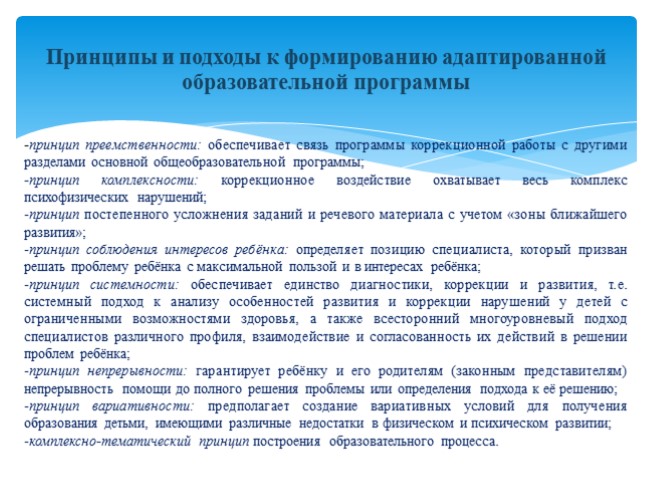 -принцип вариативности: предполагает создание вариативных условий для получения образования детьми, имеющими различные недостатки в физическом и психическом развитии;