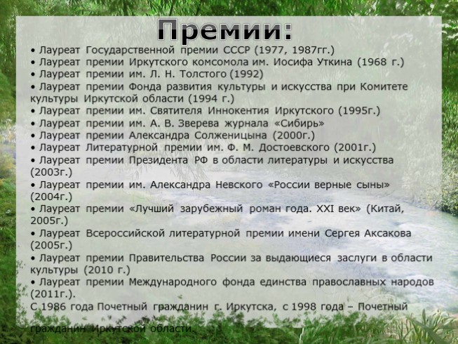 • Лауреат Государственной премии СССР (1977, 1987гг.) • Лауреат премии Иркутского комсомола им. Иосифа Уткина (1968 г.) • Лауреат премии им. Л. Н. Толстого (1992) • Лауреат премии Фонда развития культуры и искусства при Комитете культуры Иркутской области (1994 г.) • Лауреат премии им. Святителя Иннокентия Иркутского (1995г.) • Лауреат премии им. А. В. Зверева журнала «Сибирь» • Лауреат премии Александра Солженицына (2000г.) • Лауреат Литературной премии им. Ф. М. Достоевского (2001г.) • Лауреат премии Президента РФ в области литературы и искусства (2003г.) • Лауреат премии им. Александра Невского «России верные сыны» (2004г.) • Лауреат премии «Лучший зарубежный роман года. XXI век» (Китай, 2005г.) • Лауреат Всероссийской литературной премии имени Сергея Аксакова (2005г.) • Лауреат премии Правительства России за выдающиеся заслуги в области культуры (2010 г.) • Лауреат премии Международного фонда единства православных народов (2011г.). С 1986 года Почетный гражданин г. Иркутска, с 1998 года – Почетный гражданин Иркутской области.