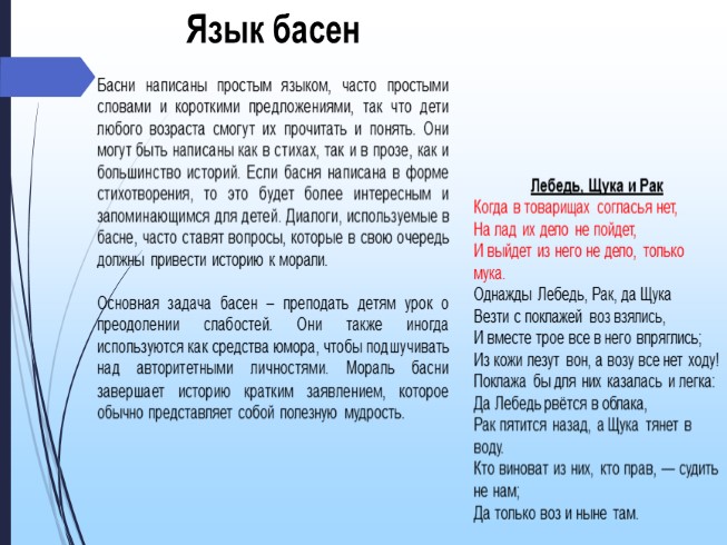 Басни написаны простым языком, часто простыми словами и короткими предложениями, так что дети любого возраста смогут их прочитать и понять. Они могут быть написаны как в стихах, так и в прозе, как и большинство историй. Если басня написана в форме стихотворения, то это будет более интересным и запоминающимся для детей. Диалоги, используемые в басне, часто ставят вопросы, которые в свою очередь должны привести историю к морали.