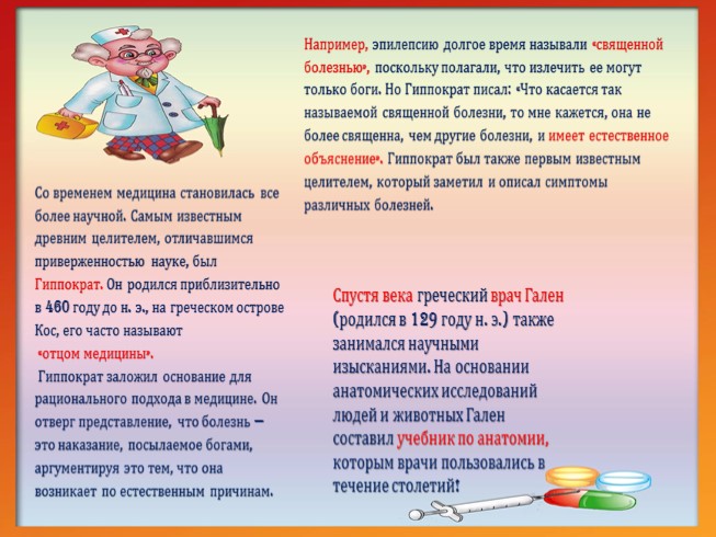 Например, эпилепсию долгое время называли «священной болезнью», поскольку полагали, что излечить ее могут только боги. Но Гиппократ писал: «Что касается так называемой священной болезни, то мне кажется, она не более священна, чем другие болезни, и имеет естественное объяснение». Гиппократ был также первым известным целителем, который заметил и описал симптомы различных болезней.