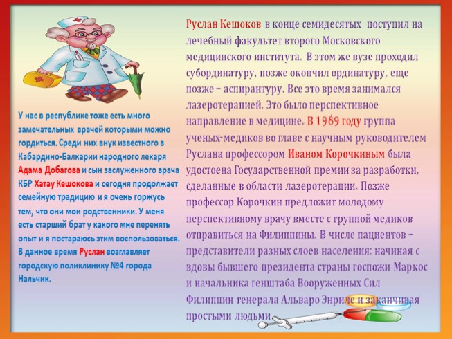 У нас в республике тоже есть много замечательных врачей которыми можно гордиться. Среди них внук известного в Кабардино-Балкарии народного лекаря Адама Добагова и сын заслуженного врача КБР Хатау Кешокова и сегодня продолжает семейную традицию и я очень горжусь тем, что они мои родственники. У меня есть старший брат у какого мне перенять опыт и я постараюсь этим воспользоваться. В данное время Руслан возглавляет городскую поликлинику №4 города Нальчик.