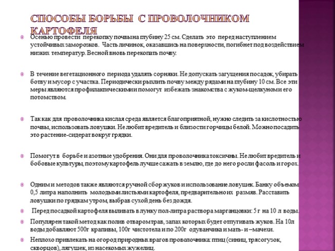 2. Познакомиться с различными способами борьбы с проволочником без применения химических средств. Для этого использовать информацию Интернет ресурсов, сельскохозяйственной литературы, опыт родителей, знакомых.