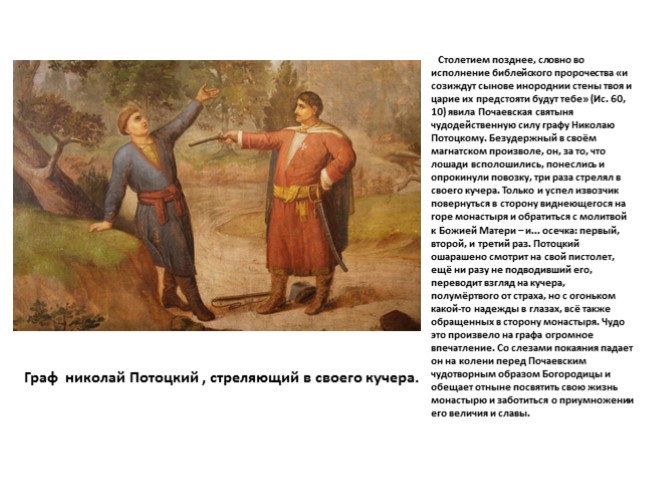 Столетием позднее, словно во исполнение библейского пророчества «и созиждут сынове инороднии стены твоя и царие их предстояти будут тебе» (Ис. 60, 10) явила Почаевская святыня чудодейственную силу графу Николаю Потоцкому. Безудержный в своём магнатском произволе, он, за то, что лошади всполошились, понеслись и опрокинули повозку, три раза стрелял в своего кучера. Только и успел извозчик повернуться в сторону виднеющегося на горе монастыря и обратиться с молитвой к Божией Матери – и... осечка: первый, второй, и третий раз. Потоцкий ошарашено смотрит на свой пистолет, ещё ни разу не подводивший его, переводит взгляд на кучера, полумёртвого от страха, но с огоньком какой-то надежды в глазах, всё также обращенных в сторону монастыря. Чудо это произвело на графа огромное впечатление. Со слезами покаяния падает он на колени перед Почаевским чудотворным образом Богородицы и обещает отныне посвятить свою жизнь монастырю и заботиться о приумножении его величия и славы.