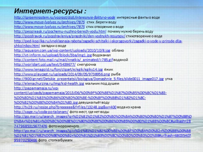 http://ped-kopilka.ru/vneklasnaja-rabota/zagadki-schitalki-i-skorogovorki/zagadki-o-vode-v-prirode-dlja-shkolnikov.html загадки о воде