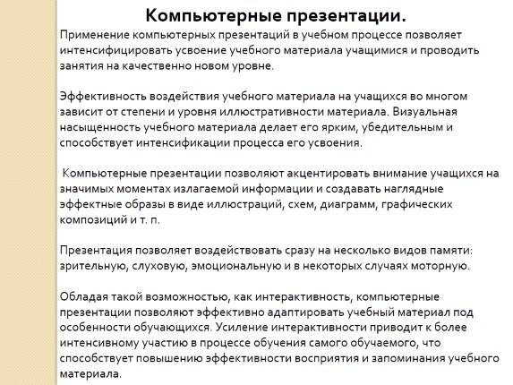 Компьютерные презентации позволяют акцентировать внимание учащихся на значимых моментах излагаемой информации и создавать наглядные эффектные образы в виде иллюстраций, схем, диаграмм, графических композиций и т. п.