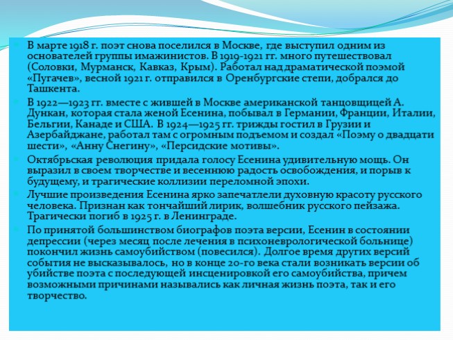 Лучшие произведения Есенина ярко запечатлели духовную красоту русского человека. Признан как тончайший лирик, волшебник русского пейзажа. Трагически погиб в 1925 г. в Ленинграде.