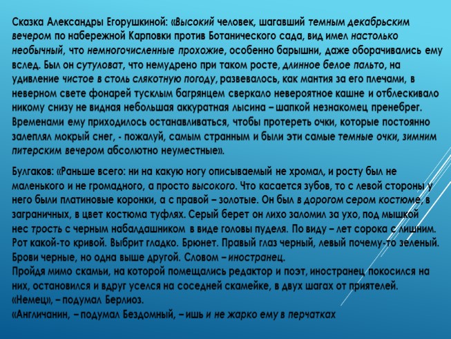 Булгаков: «Раньше всего: ни на какую ногу описываемый не хромал, и росту был не маленького и не громадного, а просто высокого. Что касается зубов, то с левой стороны у него были платиновые коронки, а с правой – золотые. Он был в дорогом сером костюме, в заграничных, в цвет костюма туфлях. Серый берет он лихо заломил за ухо, под мышкой нес трость с черным набалдашником в виде головы пуделя. По виду – лет сорока с лишним. Рот какой-то кривой. Выбрит гладко. Брюнет. Правый глаз черный, левый почему-то зеленый. Брови черные, но одна выше другой. Словом – иностранец. Пройдя мимо скамьи, на которой помещались редактор и поэт, иностранец покосился на них, остановился и вдруг уселся на соседней скамейке, в двух шагах от приятелей. «Немец», – подумал Берлиоз. «Англичанин, – подумал Бездомный, – ишь и не жарко ему в перчатках