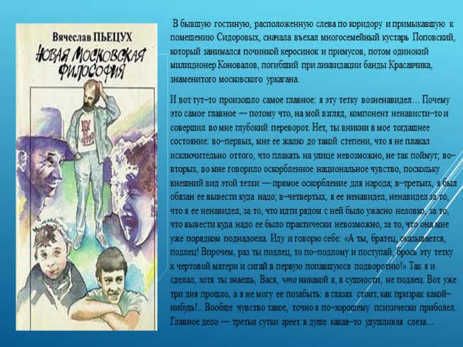 И вот тут–то произошло самое главное: я эту тетку возненавидел… Почему это самое главное — потому что, на мой взгляд, компонент ненависти–то и совершил во мне глубокий переворот. Нет, ты вникни в мое тогдашнее состояние: во–первых, мне ее жалко до такой степени, что я не плакал исключительно оттого, что плакать на улице невозможно, не так поймут; во–вторых, во мне говорило оскорбленное национальное чувство, поскольку внешний вид этой тетки — прямое оскорбление для народа; в–третьих, я был обязан ее вывести куда надо; в–четвертых, я ее ненавидел, ненавидел за то, что я ее ненавидел, за то, что идти рядом с ней было ужасно неловко, за то, что вывести куда надо ее было практически невозможно, за то, что она мне уже порядком поднадоела. Иду и говорю себе: «А ты, братец, оказывается, подлец! Впрочем, раз ты подлец, то по–подлому и поступай, брось эту тетку к чертовой матери и сигай в первую попавшуюся подворотню!» Так я и сделал, хотя ты знаешь, Вася, что никакой я, в сущности, не подлец. Вот уже три дня прошло, а я не могу ее позабыть: в глазах стоит, как призрак какой–нибудь!.. Вообще чувство такое, точно я по–хорошему психически приболел. Главное дело — третьи сутки зреет в душе какая–то удушливая слеза…
