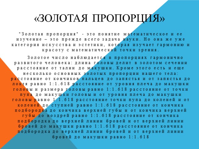 Золотое число наблюдается в пропорциях гармонично развитого человека: длина головы делит в золотом сечении расстояние от талии до макушки. Кроме этого есть и еще несколько основных золотых пропорции нашего тела: расстояние от кончиков пальцев до запястья и от запястья до локтя равно 1:1.618 расстояние от уровня плеча до макушки головы и размера головы равно 1:1.618 расстояние от точки пупа до макушки головы и от уровня плеча до макушки головы равно 1:1.618 расстояние точки пупа до коленей и от коленей до ступней равно 1:1.618 расстояние от кончика подбородка до кончика верхней губы и от кончика верхней губы до ноздрей равно 1:1.618 расстояние от кончика подбородка до верхней линии бровей и от верхней линии бровей до макушки равно 1:1.618 расстояние от кончика подбородка до верхней линии бровей и от верхней линии бровей до макушки равно 1:1.618