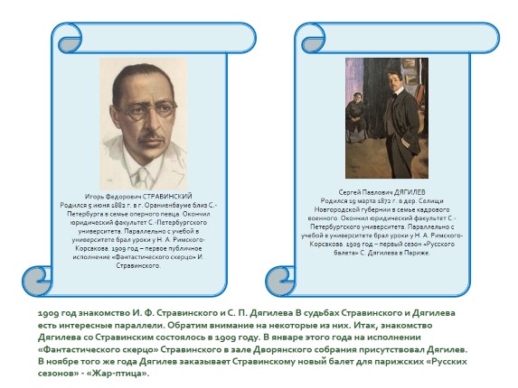 1909 год знакомство И. Ф. Стравинского и С. П. Дягилева В судьбах Стравинского и Дягилева есть интересные параллели. Обратим внимание на некоторые из них. Итак, знакомство Дягилева со Стравинским состоялось в 1909 году. В январе этого года на исполнении «Фантастического скерцо» Стравинского в зале Дворянского собрания присутствовал Дягилев. В ноябре того же года Дягилев заказывает Стравинскому новый балет для парижских «Русских сезонов» - «Жар-птица».