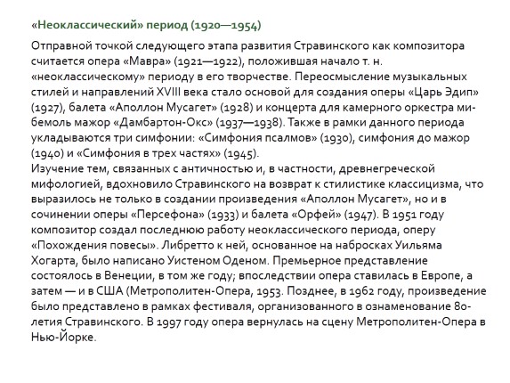 Изучение тем, связанных с античностью и, в частности, древнегреческой мифологией, вдохновило Стравинского на возврат к стилистике классицизма, что выразилось не только в создании произведения «Аполлон Мусагет», но и в сочинении оперы «Персефона» (1933) и балета «Орфей» (1947). В 1951 году композитор создал последнюю работу неоклассического периода, оперу «Похождения повесы». Либретто к ней, основанное на набросках Уильяма Хогарта, было написано Уистеном Оденом. Премьерное представление состоялось в Венеции, в том же году; впоследствии опера ставилась в Европе, а затем — и в США (Метрополитен-Опера, 1953. Позднее, в 1962 году, произведение было представлено в рамках фестиваля, организованного в ознаменование 80-летия Стравинского. В 1997 году опера вернулась на сцену Метрополитен-Опера в Нью-Йорке.