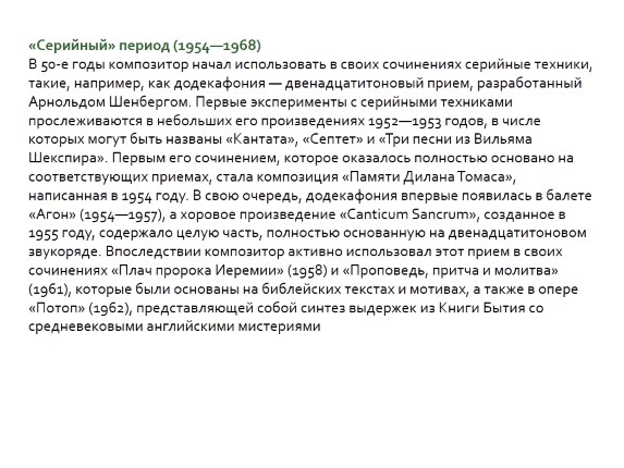 В 50-е годы композитор начал использовать в своих сочинениях серийные техники, такие, например, как додекафония — двенадцатитоновый прием, разработанный Арнольдом Шенбергом. Первые эксперименты с серийными техниками прослеживаются в небольших его произведениях 1952—1953 годов, в числе которых могут быть названы «Кантата», «Септет» и «Три песни из Вильяма Шекспира». Первым его сочинением, которое оказалось полностью основано на соответствующих приемах, стала композиция «Памяти Дилана Томаса», написанная в 1954 году. В свою очередь, додекафония впервые появилась в балете «Агон» (1954—1957), а хоровое произведение «Canticum Sancrum», созданное в 1955 году, содержало целую часть, полностью основанную на двенадцатитоновом звукоряде. Впоследствии композитор активно использовал этот прием в своих сочинениях «Плач пророка Иеремии» (1958) и «Проповедь, притча и молитва» (1961), которые были основаны на библейских текстах и мотивах, а также в опере «Потоп» (1962), представляющей собой синтез выдержек из Книги Бытия со средневековыми английскими мистериями