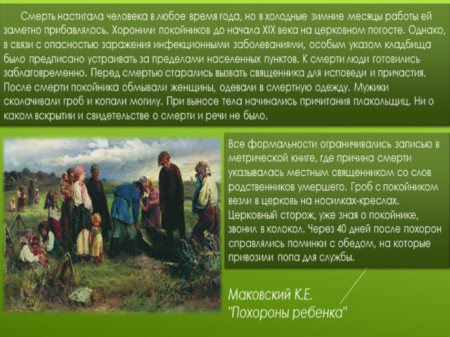 Смерть настигала человека в любое время года, но в холодные зимние месяцы работы ей заметно прибавлялось. Хоронили покойников до начала XIX века на церковном погосте. Однако, в связи с опасностью заражения инфекционными заболеваниями, особым указом кладбища было предписано устраивать за пределами населенных пунктов. К смерти люди готовились заблаговременно. Перед смертью старались вызвать священника для исповеди и причастия. После смерти покойника обмывали женщины, одевали в смертную одежду. Мужики сколачивали гроб и копали могилу. При выносе тела начинались причитания плакольщиц. Ни о каком вскрытии и свидетельстве о смерти и речи не было.