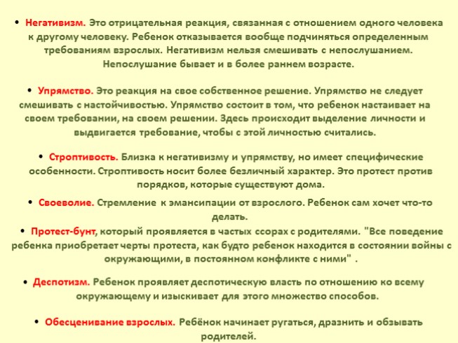 • Негативизм. Это отрицательная реакция, связанная с отношением одного человека к другому человеку. Ребенок отказывается вообще подчиняться определенным требованиям взрослых. Негативизм нельзя смешивать с непослушанием. Непослушание бывает и в более раннем возрасте.