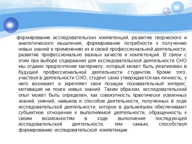 формирование исследовательских компетенций, развитие творческого и аналитического мышления, формирование потребности к получению новых знаний и применению их в своей профессиональной деятельности, развитие профессионально важных качеств и компетенций. В связи с этим при выборе содержания для исследовательской деятельности СНО мы отдаем предпочтение материалу, который может быть реализован в будущей профессиональной деятельности студентов. Кроме того, участвуя в деятельности СНО, студент само утверждается как личность, у него возникает и укрепляет свои позиции познавательный интерес, мотивация на поиск новых знаний. Таким образом, исследовательский опыт может быть определен, как совокупность практически усвоенных знаний, умений, навыков и способов деятельности, полученных в ходе исследовательской деятельности, которое в дальнейшем обеспечивают субъектное отношение к выполняемой деятельности, обращенность к своим возможностям в ходе выполнения последующей исследовательской деятельности, тем самым, способствуя формированию исследовательской компетенции.