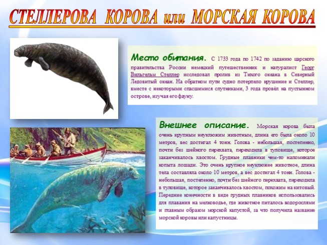 И уже к 1754 году эти морские коровы были истреблены близ острова Медного, а в 1768 году и у острова Беринга. И уже к 1754 году морские коровы были истреблены близ острова Медного, а в 1768 году и у острова Беринга. Известна она была человечеству всего 27 лет. Правда, отдельные свидетельства моряков, якобы заметивших несколько морских коров приходили до 1970-х годов и, возможно, позже.
