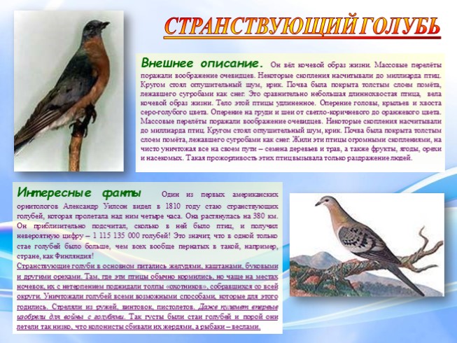 Интересные факты Один из первых американских орнитологов Александр Уилсон видел в 1810 году стаю странствующих голубей, которая пролетала над ним четыре часа. Она растянулась на 380 км. Он приблизительно подсчитал, сколько в ней было птиц, и получил невероятную цифру – 1 115 135 000 голубей! Это значит, что в одной только стае голубей было больше, чем всех вообще пернатых в такой, например, стране, как Финляндия!
