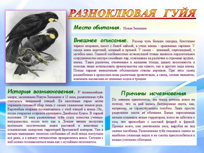 История возникновения. У полинезийцев-маори, заселивших Новую Зеландию в 15 века, разноклювая гуйя считалась священной птицей. Её хвостовые перья могли украшать головной убор лишь у самых уважаемых членов рода. Европейцы впервые познакомились с этой птицей в конце 18в., после открытия островов капитаном Джеймсон Куком. В первой половине 19 века разноклювая гуйя стала известна учёным-натуралистам, после того как в Лондон начали поступать коллекции экзотических видов растений и животных с осваиваемых заморских территорий Британской империи. Уже в начале нынешнего столетия сообщения об этой птице поступали всё реже, а к началу пятидесятых прекратились вовсе. Сегодня с ней можно познакомиться лишь как с музейным экспонатом.