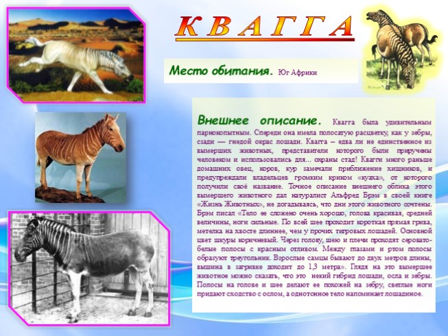 Внешнее описание. Квагга была удивительным парнокопытным. Спереди она имела полосатую расцветку, как у зебры, сзади — гнедой окрас лошади. Квагга – едва ли не единственное из вымерших животных, представители которого были приручены человеком и использовались для... охраны стад! Квагги много раньше домашних овец, коров, кур замечали приближение хищников, и предупреждали владельцев громким криком «куаха», от которого получили своё название. Точное описание внешнего облика этого вымершего животного дал натуралист Альфред Брэм в своей книге «Жизнь Животных», не догадываясь, что дни этого животного сочтены. Брэм писал «Тело ее сложено очень хорошо, голова красивая, средней величины, ноги сильные. По всей шее проходит короткая прямая грива, метелка на хвосте длиннее, чем у прочих тигровых лошадей. Основной цвет шкуры коричневый. Через голову, шею и плечи проходят серовато-белые полосы с красным отливом. Между глазами и ртом полосы образуют треугольник. Взрослые самцы бывают до двух метров длины, вышина в загривке доходит до 1,3 метра». Глядя на это вымершее животное можно сказать, что это некий гибрид лошади, осла и зебры. Полосы на голове и шее делают ее похожей на зебру, светлые ноги придают сходство с ослом, а однотонное тело напоминает лошадиное.