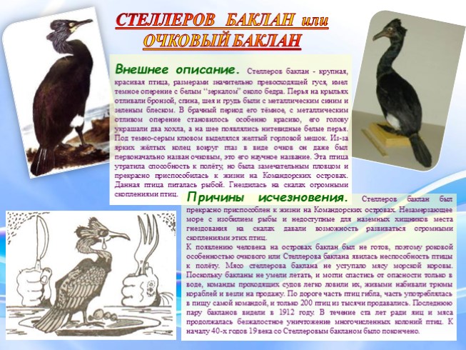 Внешнее описание. Стеллеров баклан - крупная, красивая птица, размерами значительно превосходящей гуся, имел темное оперение с белым “зеркалом” около бедра. Перья на крыльях отливали бронзой, спина, шея и грудь были с металлическим синим и зеленым блеском. В брачный период его тёмное, с металлическим отливом оперение становилось особенно красиво, его голову украшали два хохла, а на шее появлялись нитевидные белые перья. Под темно-серым клювом выделялся желтый горловой мешок. Из-за ярких жёлтых колец вокруг глаз в виде очков он даже был первоначально назван очковым, это его научное название. Эта птица утратила способность к полёту, но была замечательным пловцом и прекрасно приспособилась к жизни на Командорских островах. Данная птица питалась рыбой. Гнездилась на скалах огромными скоплениями птиц.