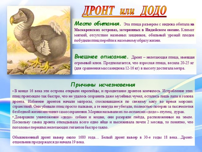 Обыкновенный дронт вымер около 1680 года… Белый дронт вымер в 30-е годы 18 века…Дронт-отшельник продержался до начала 19 века.