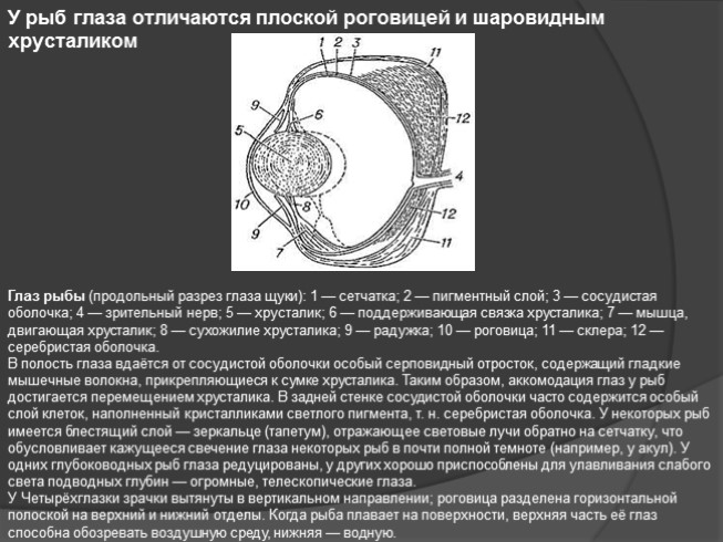Глаз рыбы (продольный разрез глаза щуки): 1 — сетчатка; 2 — пигментный слой; 3 — сосудистая оболочка; 4 — зрительный нерв; 5 — хрусталик; 6 — поддерживающая связка хрусталика; 7 — мышца, двигающая хрусталик; 8 — сухожилие хрусталика; 9 — радужка; 10 — роговица; 11 — склера; 12 — серебристая оболочка.