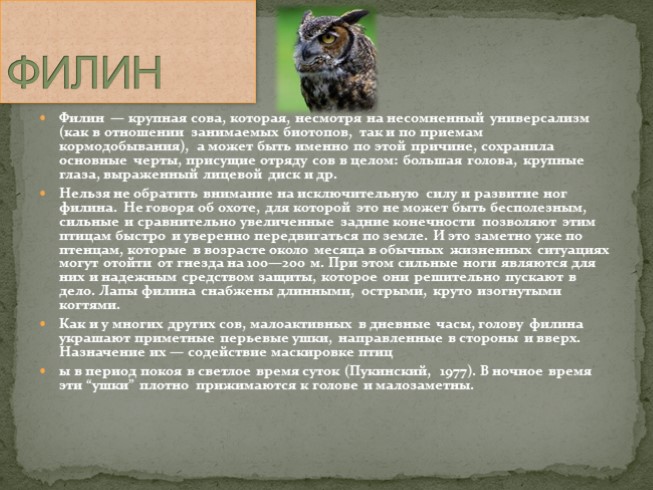 Филин — крупная сова, которая, несмотря на несомненный универсализм (как в отношении занимаемых биотопов, так и по приемам кормодобывания), а может быть именно по этой причине, сохранила основные черты, присущие отряду сов в целом: большая голова, крупные глаза, выраженный лицевой диск и др.
