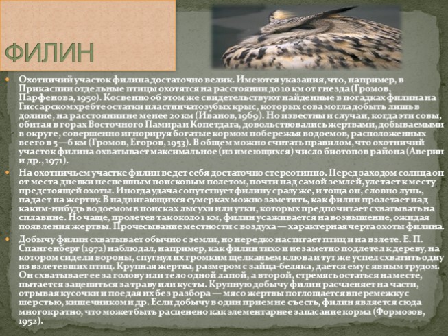 Охотничий участок филина достаточно велик. Имеются указания, что, например, в Прикаспии отдельные птицы охотятся на расстоянии до 10 км от гнезда (Громов, Парфенова, 1950). Косвенно об этом же свидетельствуют найденные в погадках филина на Гиссарском хребте остатки пластинчатозубых крыс, которых сова могла добыть лишь в долине, на расстоянии не менее 20 км (Иванов, 1969). Но известны и случаи, когда эти совы, обитая в горах Восточного Памира и Копетдага, довольствовались жертвами, добываемыми в округе, совершенно игнорируя богатые кормом побережья водоемов, расположенных всего в 5—б км (Громов, Егоров, 1953). В общем можно считать правилом, что охотничий участок филина охватывает максимальное (из имеющихся) число биотопов района (Аверин и др., 1971).