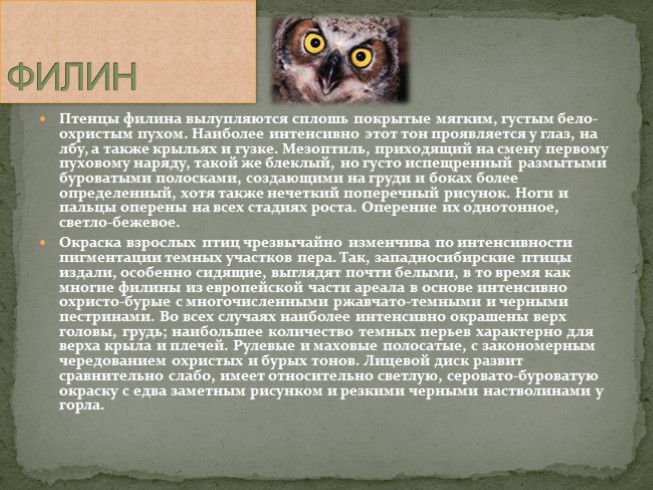 Как и у многих других сов, малоактивных в дневные часы, голову филина украшают приметные перьевые ушки, направленные в стороны и вверх. Назначение их — содействие маскировке птиц