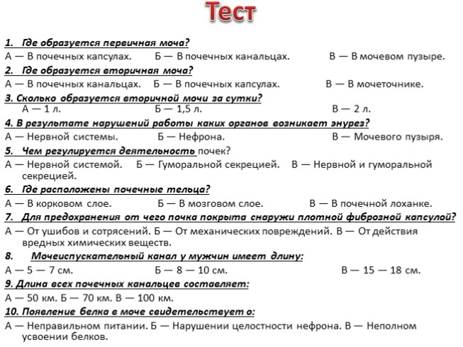 3. Сколько образуется вторичной мочи за сутки? А — 1 л. Б — 1,5 л. В — 2 л.