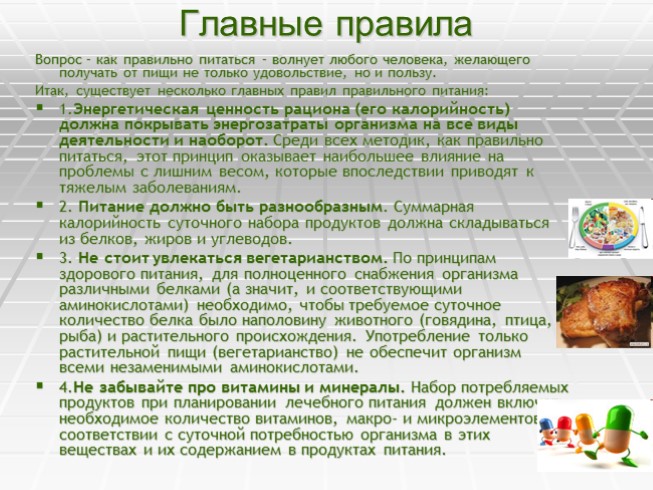 1.Энергетическая ценность рациона (его калорийность) должна покрывать энергозатраты организма на все виды деятельности и наоборот. Среди всех методик, как правильно питаться, этот принцип оказывает наибольшее влияние на проблемы с лишним весом, которые впоследствии приводят к тяжелым заболеваниям.